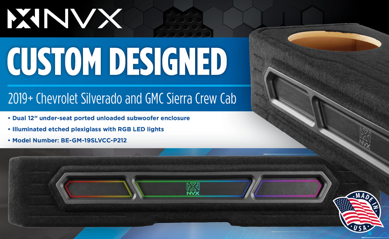 Custom Dual 12" Under-seat Ported Unloaded Subwoofer Enclosure with LED Lighting for 2019-2024 Chevrolet Silverado and GMC Sierra Crew Cab Trucks | BE-GM-19SLVCC-P212