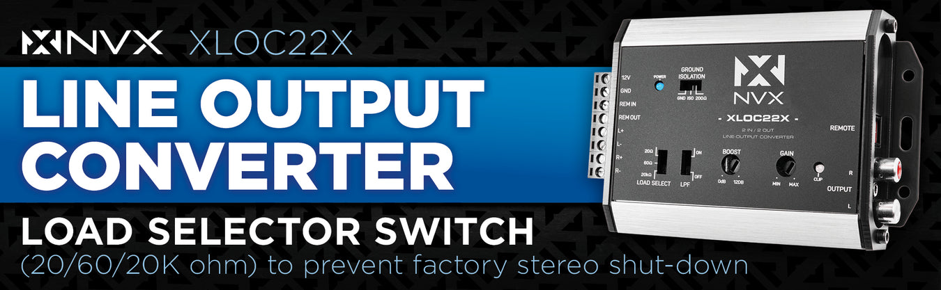 • Load selection switch (20, 60, or 20K ohms) to prevent factory stereo shut-down